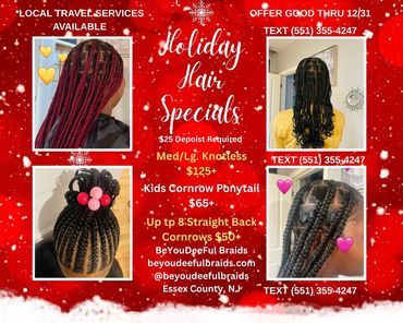 For best results, clients must have a minimum of 4-inches of natural hair to braid for services. When booking appointments, please wait for a confirmation before sending your deposit. Thank you for your understanding. :-)